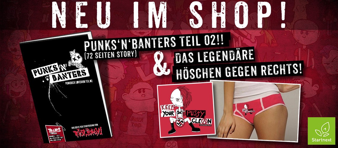 Du bist hier auf der offiziellen Website von Punks’n’Banters gelandet – Der schräge Punk Comic vollgespickt mit Alk, Drogen und Anarchie! Thema sind verschiedene Punk-Klischees und etwas Kritik an der Szene, aber hauptsächlich chaotischer Spaß und eine vielseitige Geschichte! Ebenso sind die Charaktere keine Helden und machen gerne Fehler. Dennoch hoffe ich, dass die Stories unterhaltend sind und Menschen in verschiedene Richtungen zum Nachdenken und Diskutieren bringt.